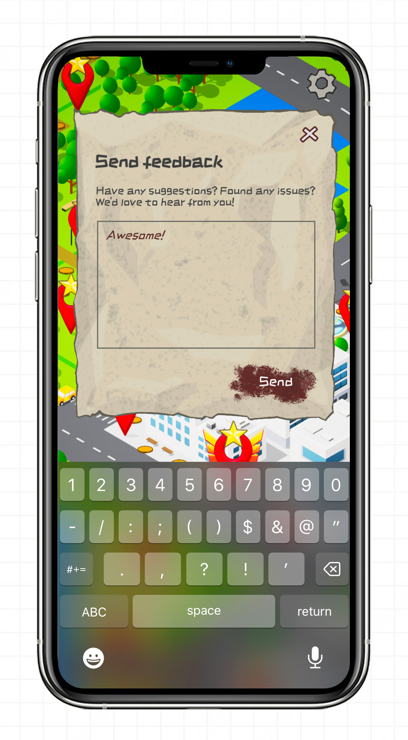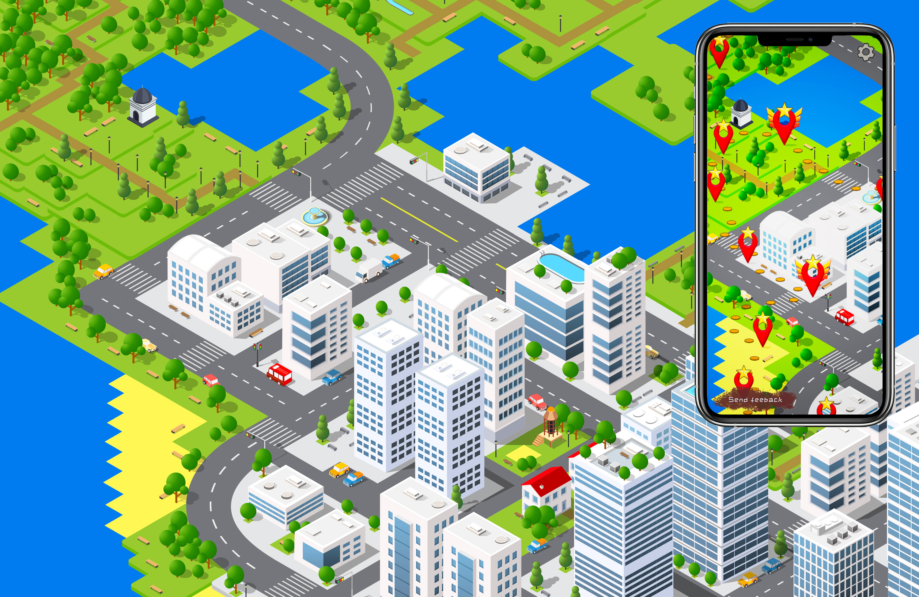 The interactive city map draws inspiration from downtown Vancouver and was constructed manually using licensed isometric city asset packs, creating an engaging navigational interface for level progression.