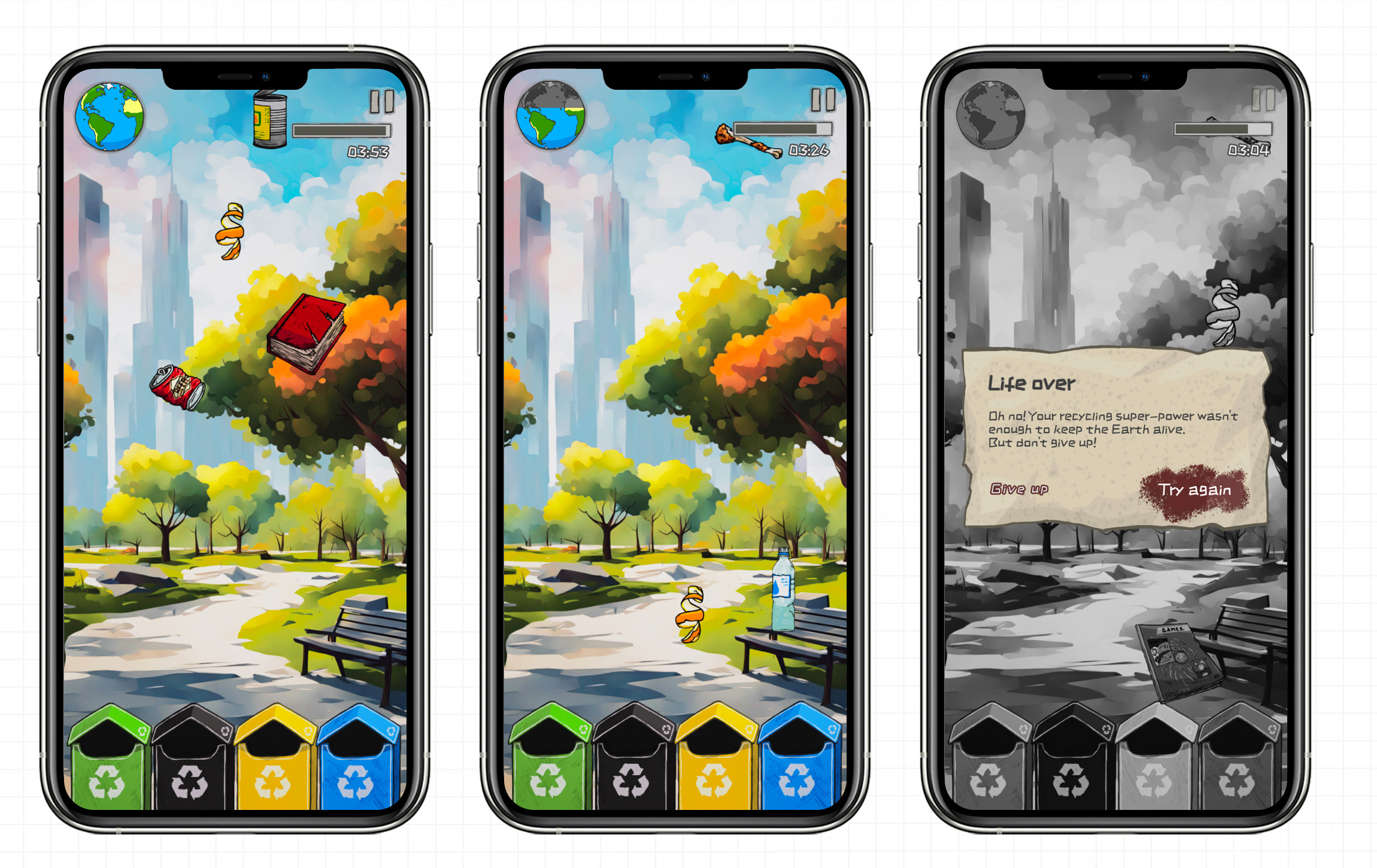 Player's "life" is visualized through an Earth icon positioned in the upper-left corner of the screen. The life meter decreases when items fall to the ground unsorted or are placed in incorrect bins, with this deterioration shown visually as portions of the Earth becoming barren. Players can restore life by correctly sorting items.