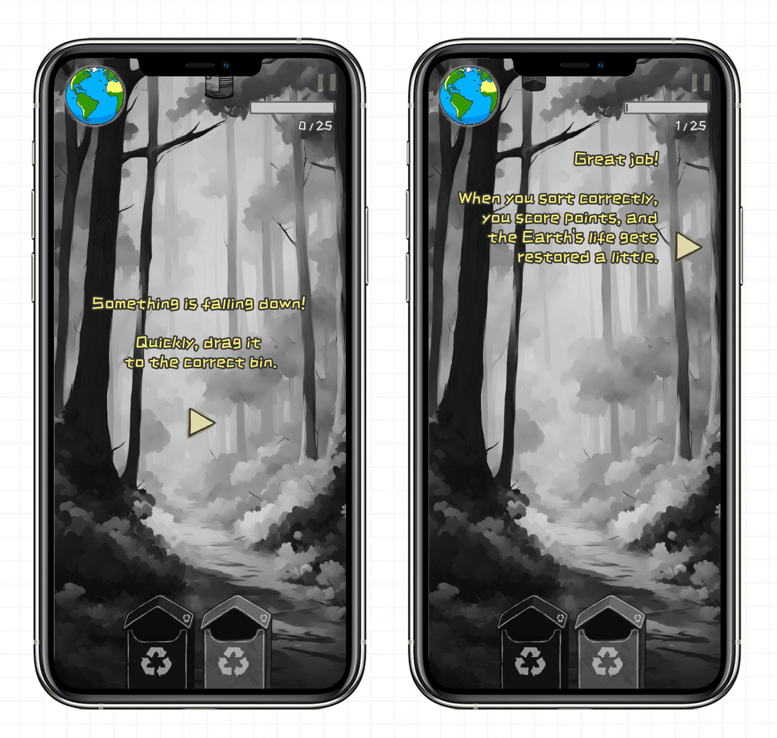 Players clear levels by catching falling waste items using touch controls and placing them into the appropriate recycling bins.